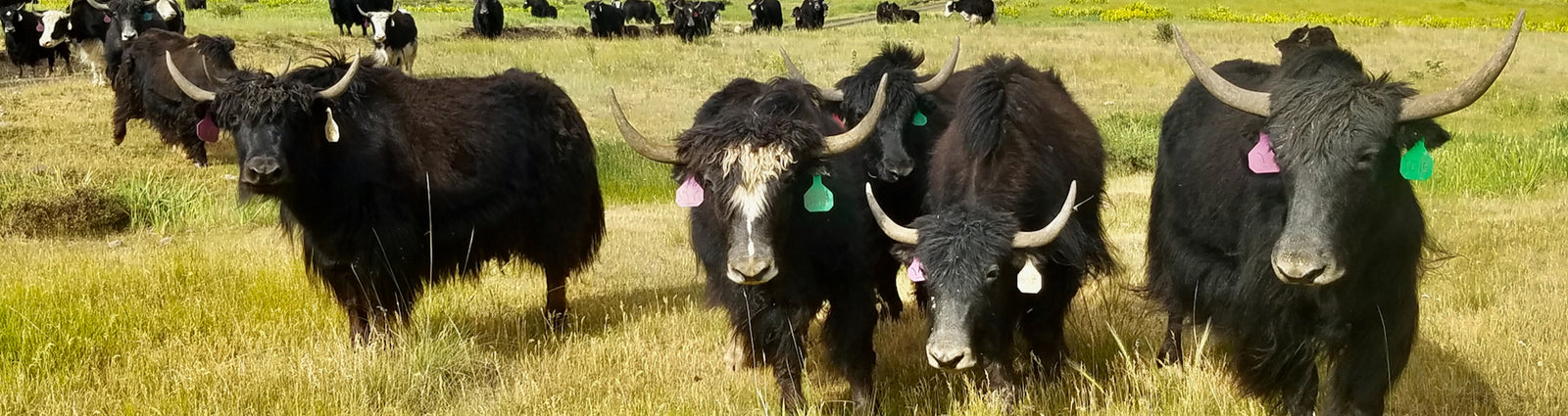 Grunting ox (Bos grunniens) is another name for the yak due to its loud grunting noises. In Tibet only the male is called a yak, while the female is referred to as a dri or nak. In the west, however, we refer to both males and females as yaks. The animals are well suited to our high elevation due to their evolutionary adaptation to elevations from 14,000-20,000 feet in Tibet, Nepal, Mongolia, and Central Asia. Yak lung capacity is approximately three times that of cattle, and their red blood cells are smaller and more numerous than Bos taurus (cattle).