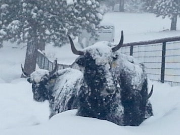 Today our cattle and yaks spend the winter months on the farm’s hay fields enjoying copious quantities of hay, so they will remain healthy and stress free even in the harshest of conditions. The hay comes from our farm or neighboring farms, which further ensures healthy animals, as their gut biome is predisposed to their local food source.
